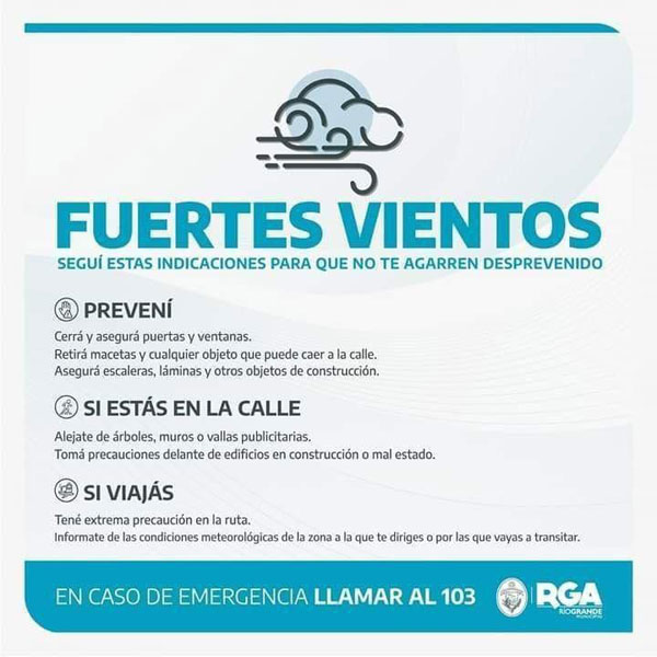RIO GRANDE.-    El Municipio informa, a través de la Dirección de Defensa Civil, que rige para este jueves 13 de junio una alerta amarilla por fuertes vientos, emitida por el Servicio Meteorológico Nacional para toda la provincia.