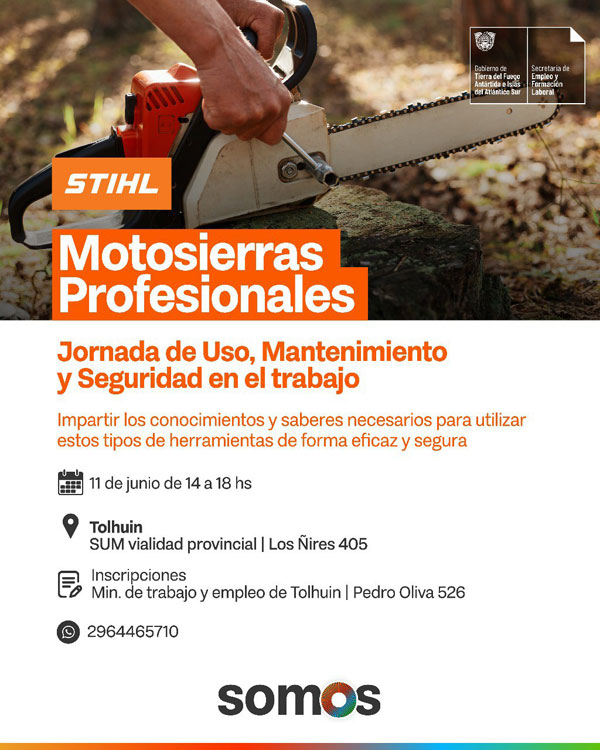 TOLHUIN.- El Gobierno de Tierra del Fuego AIAS, a través de la Secretaría de Empleo y Formación Laboral del Ministerio de Trabajo y Empleo llevará adelante en Tolhuin una jornada sobre el uso, mantenimiento y seguridad de motosierras profesionales.