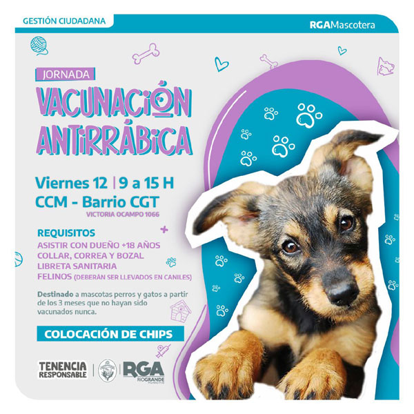 RIO GRANDE.-   Se desarolla este viernes 12 de julio, en el Centro Comunitario Municipal del barrio CGT. Está destinada a caninos y felinos, a partir de los 3 meses que no hayan sido vacunados nunca o posean su vacuna vencida. A través de esta política, se fortalece el cuidado y protección de las mascotas de Río Grande.