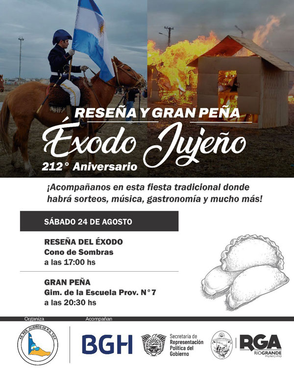 La organización del 212° aniversario del Éxodo Jujeño la lleva adelante la Asociación de Residentes Jujeños de nuestra ciudad acompañada del Municipio de Río Grande, la empresa BGH y la Secretaría de Representación Política del Gobierno.