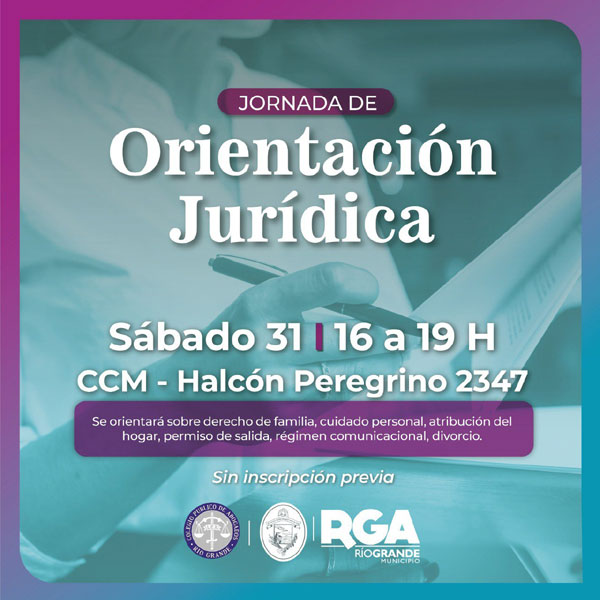 RIO GRANDE.- En un trabajo conjunto entre las Secretarías de Género y Desarrollo Comunitario y Gestión Ciudadana y el Colegio Público de Abogados de Río Grande, llevan adelante Jornadas de Orientación Jurídica. La tercera y última se realizará este sábado 31 de agosto en el Centro Comunitario Municipal (Halcón Peregrino 2347), desde las 16 horas hasta las 19 horas.