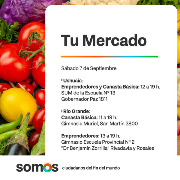En Ushuaia, ‘Tu Mercado’ se llevará a cabo en el SUM de la Escuela N°13, Gobernador Paz 1811, el día sábado con productos de la Canasta Básica, de 12:00 a 19:00, y el domingo con la presencia de emprendedores locales, de 13:00 a 19:00.