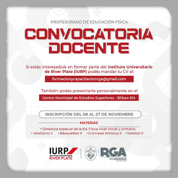 RIO GRANDE.- La Agencia Municipal de Deportes, Cultura y Turismo informa que se encuentra abierta la inscripción para concursar como docente del Profesorado Universitario de Educación Física (IURP).