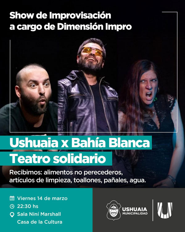 USHUAIA.- La Secretaría de Cultura y Educación de la Municipalidad de Ushuaia llevará adelante este viernes 14 de marzo a las 22:30 horas en la Sala Niní Marshall de la Casa de la Cultura un show de improvisación bajo la consigna “Teatro Solidario: Ushuaia x Bahía Blanca”.