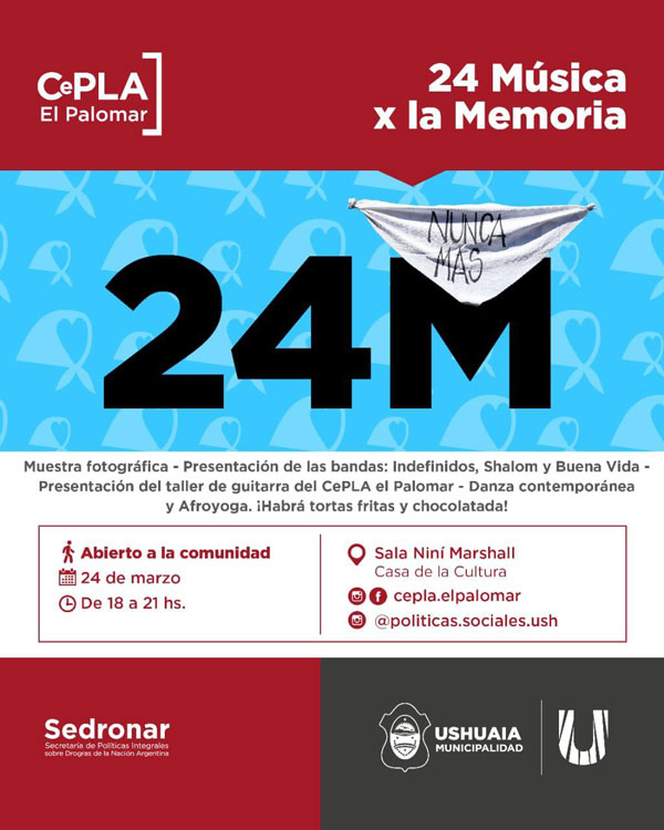 USHUAIA.-    Este 24 de marzo, en conmemoración del Día de la Memoria por la Verdad y la Justicia, se realizará una jornada de arte y reflexión organizada por la Secretaría de Políticas Sociales, Sanitarias y Derechos Humanos de la Municipalidad de Ushuaia, en colaboración con la Secretaría de Cultura y Educación del Municipio.