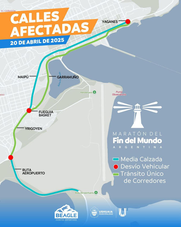 USHUAIA.- La Municipalidad de Ushuaia a través de la Dirección de Tránsito dependiente de la Secretaría de Gobierno informó que el domingo 20 de abril se llevará adelante la maratón Fin del Mundo, con lo cual se realizará el corte total de las avenidas Garramuño, Prefectura Naval e Hipólito Yrigoyen, mientras que en la Avenida Maipú habrá un carril especial. La interrupción será desde las 8 hasta las 14 horas aproximadamente.