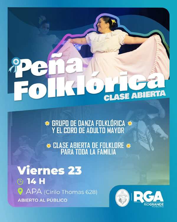RIO GRANDE.- Este viernes 23 de mayo a las 14 horas en APA (Cirilo Thomas 628), el Municipio de Río Grande, a través de la Secretaria de Gestión Ciudadana, llevará adelante una peña folklórica destinada a fortalecer la identidad y el encuentro comunitario. La propuesta es abierta a toda la comunidad.