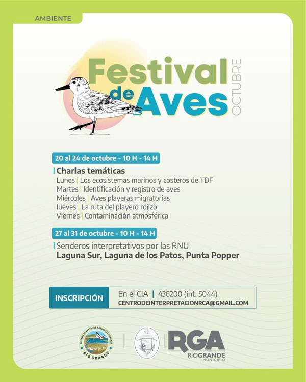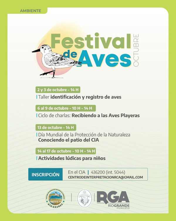 El Municipio de Río Grande invita a los vecinos y vecinas a celebrar el 16º aniversario del Festival de Aves en la ciudad. En esta oportunidad, el Centro de Interpretación Ambiental (CIA) llevará adelante una amplia agenda de actividades para que la comunidad siga aprendiendo sobre la importancia de cuidar nuestras costas y su biodiversidad.