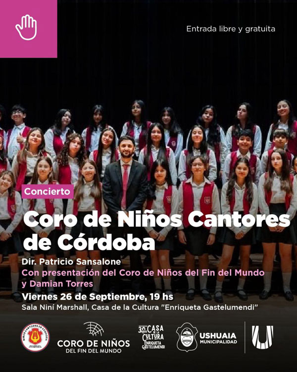 USHUAIA.- La Municipalidad de Ushuaia, a través de la Secretaría de Cultura y Educación, acompañará este viernes 26 de septiembre a las 19:00 horas en la Sala Niní Marshall de la Casa de la Cultura Enriqueta Gastelumendi el Concierto “Coro de Niños Cantores de Córdoba”, el mismo será con entrada libre y gratuita.