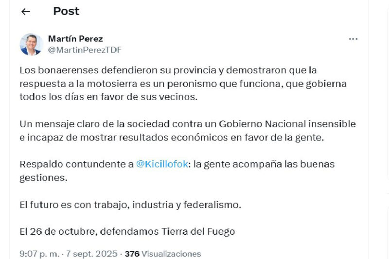 RÍO GRANDE.- El intendente de Río Grande y referente del espacio “Defendamos Tierra del Fuego”, Martín Pérez, felicitó al gobernador bonaerense Axel Kicillof por su victoria en las elecciones de la Provincia de Buenos Aires y destacó el significado político de los resultados en clave nacional.