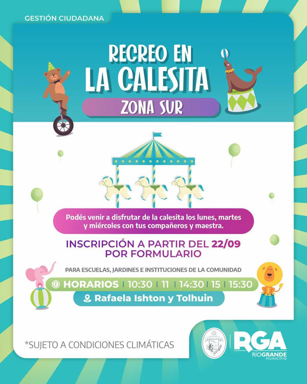 La Calesita de zona Sur está ubicada en Rafaela Ishton y Tolhuin, la cual estará disponible los lunes, martes y miércoles en los siguientes horarios: 10.30; 11; 14.30; 15 y 15.30 horas para que las niñas y niños de nivel primario e inicial se diviertan y disfruten de este espacio de encuentro y juegos.