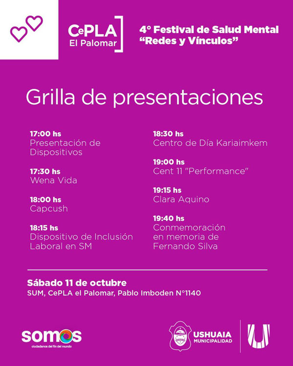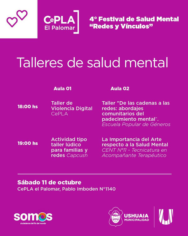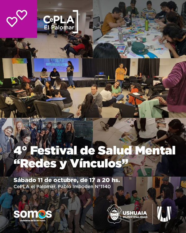 USHUAIA.- La Municipalidad de Ushuaia invita a participar del 4° Festival de Salud Mental “Redes y Vínculos”, que se llevará adelante el sábado 11 de octubre en el CePLA-El Palomar (Pablo Imboden 1140).