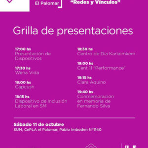 El festival contará además con una grilla de presentaciones artísticas y comunitarias, entre ellas: Wena Vida, CapcUsh, Dispositivo de Inclusión Laboral en Salud Mental, Centro de Día Kariaimkem, performance del CENT 11 y la cantante Clara Aquino. El cierre estará dedicado a la proyección de un video en conmemoración de la memoria de Fernando Silva.