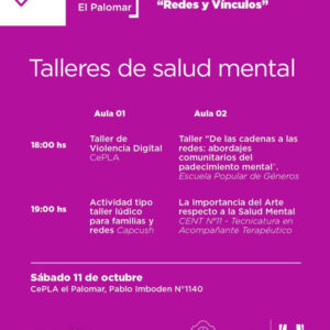 En el marco de la programación se ofrecerán talleres sobre violencia digital, abordajes comunitarios del padecimiento mental, actividades lúdicas para familias y redes, y propuestas vinculadas al arte y la salud.