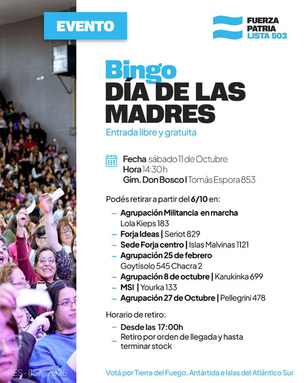 RÍO GRANDE.– En el marco del Día de las Madres, el espacio “Fuerza Patria” realizará hoy sábado 11 de octubre, desde las 14:30 horas, una nueva edición del Gran Bingo del Día de las Madres, una propuesta gratuita que promete reunir a cientos de familias en una jornada colmada de diversión, emoción y reconocimientos.