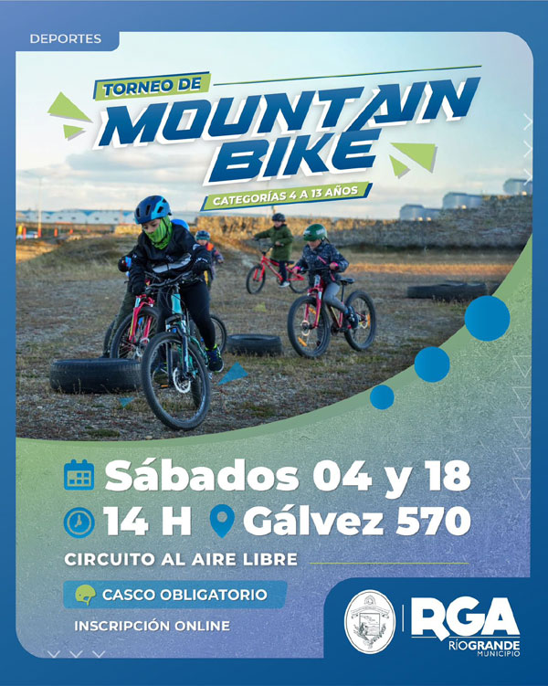 RIO GRANDE.-    El Municipio de Río Grande, a través de la Agencia de Deportes, Cultura y Turismo, invita a toda la comunidad a participar de una nueva jornada de Mountain Bike (MTB), el cual se realizará el sábado 4 de octubre en el predio de Gálvez 570, detrás del Parque de Deportes Urbanos.
