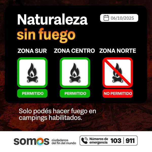 PROVINCIAL.- El día de hoy, en las ciudades de Tolhuin y Ushuaia, está permitido hacer fuego, únicamente en campings habilitados, mientras que en Río Grande está prohibido hacer fuego, aún en sitios habilitados.