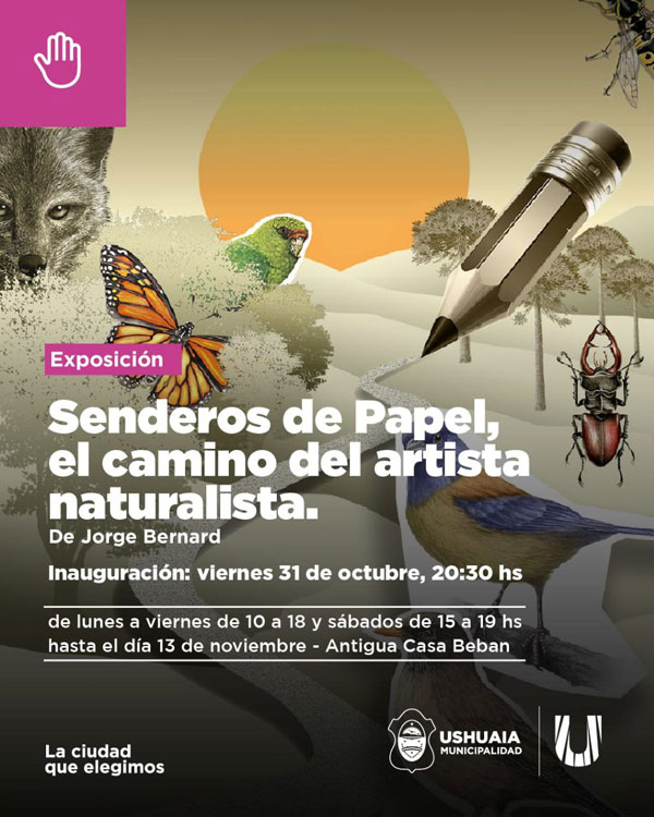 USHUAIA.-    La Secretaría de Cultura y Educación de la Municipalidad de Ushuaia acompañará la exposición “Senderos de Papel, el camino del artista naturalista” de Jorge Bernard en la Antigua Casa Beban. La misma tendrá su inauguración el día viernes 31 de octubre a las 20:30 horas y podrá ser visitada hasta el jueves 13 de noviembre.