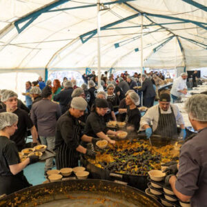 La paella estuvo a cargo de Gastronomía del Sur (GDS), empresa que desplegó un operativo de más de 100 profesionales y montó 15 paelleras —entre ellas, una versión vegetariana— para cocinar y servir las 15 mil porciones gratuitas destinadas a la comunidad. La entrega comenzó a las 14 horas y se extendió durante más de tres horas, en un clima de alegría y celebración compartida.