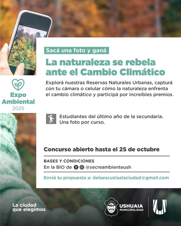 USHUAIA.- La Municipalidad de Ushuaia, a través de la Secretaría de Ambiente y las Reservas Naturales Urbanas (RNU), invita a las y los estudiantes del último año del nivel secundario a participar del concurso de fotografía “La naturaleza se rebela ante el cambio climático”, una propuesta que busca promover la conciencia ambiental y poner en valor la biodiversidad de los espacios naturales que rodean la ciudad.