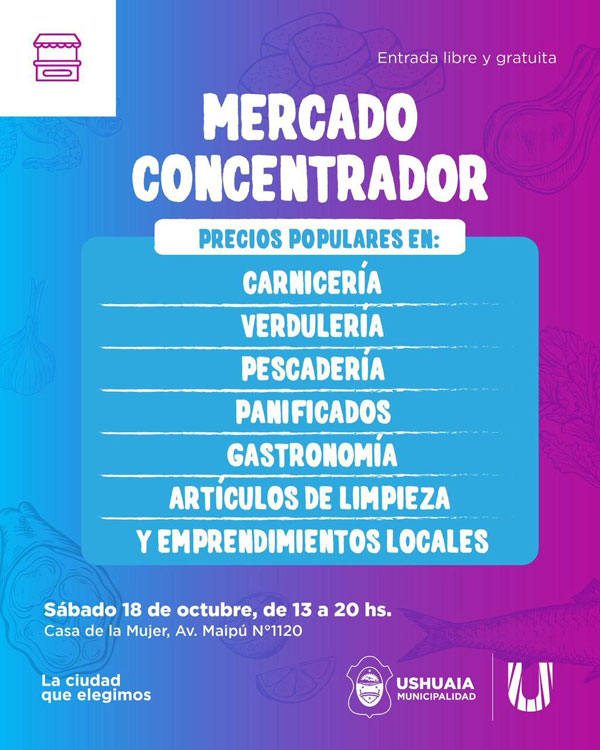 USHUAIA.-    La Municipalidad de Ushuaia invita a los vecinos y vecinas a participar de una nueva edición del Mercado Concentrador, que se realizará este sábado 18 de octubre en el horario de 13 a 20 horas, en la Casa de la Mujer, ubicada en Avenida Maipú 1120.