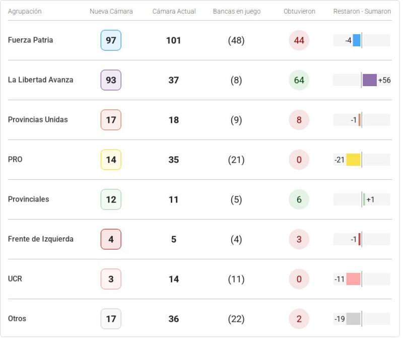 Con los resultados del escrutinio, La Libertad Avanza pasó de 37 a 93 diputados nacionales, sumando 56 bancas nuevas y transformándose en el bloque de mayor crecimiento desde el retorno de la democracia. El oficialismo había puesto en juego solo ocho lugares y logró obtener 64, un saldo político más que favorable.