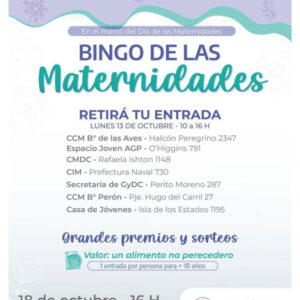 RIO GRANDE.- Aquellas interesadas en participar del tradicional Bingo podrán retirar sus entradas el lunes 13 de octubre, de 10 a 16 horas, en diferentes dependencias municipales. Dicha actividad, se realiza en el marco del Mes de las Maternidades, con el objetivo de continuar impulsando espacios de encuentro, disfrute y reflexión entre mujeres y disidencias de la ciudad.