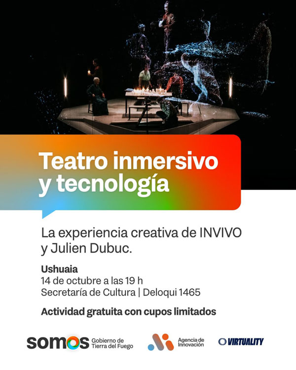 USHUAIA.- La Secretaría de Cultura de Tierra del Fuego, junto a Virtuality y la Alianza Francesa de Ushuaia, invitan a la masterclass del director francés Julien Dubuc, creador y referente de la compañía INVIVO, que se realizará el martes 14 de octubre a las 19 horas en Deloqui 1465, Ushuaia, con entrada libre y gratuita.