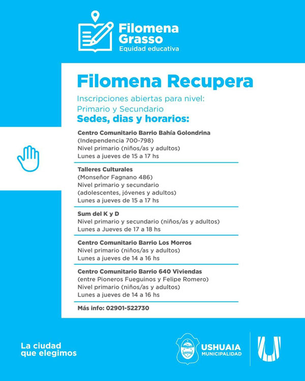 USHUAIA.- La Secretaría de Cultura y Educación de la Municipalidad de Ushuaia informa a la comunidad que se encuentran abiertas las inscripciones al “Filomena Recupera”, programa de apoyo escolar gratuito para los niveles primario y secundario contando con cupos para todas las edades en ambos casos. Quiénes deseen inscribirse, podrán hacerlo a través del teléfono 2901-522730, así como acceder a más información.