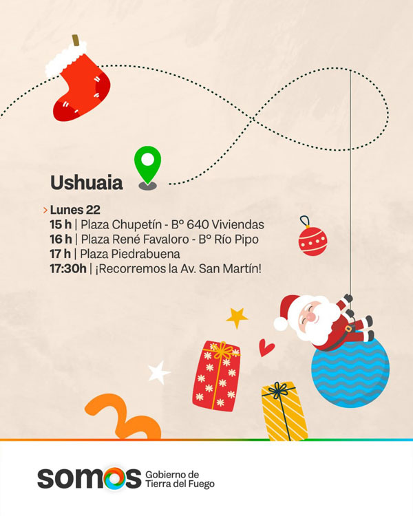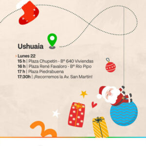 En Ushuaia, el recorrido se realizará el lunes 22 de diciembre, iniciando a las 15 horas en la Plaza Chupetín del barrio 640 viviendas, continuando a las 16 horas en la Plaza René Favaloro en el barrio Río Pipo, a las 17 horas en la Plaza Piedrabuena, y cerrando a las 17:30 horas con un recorrido por la Avenida San Martín.