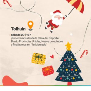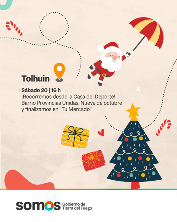 En Tolhuin, la propuesta tendrá lugar el sábado 20 de diciembre a las 16 horas, con salida desde la Casa del Deporte, recorriendo los barrios Provincias Unidas y Nueve de Octubre, y finalizando en el evento “Tu Mercado”, donde las infancias podrán dejar su cartita a Papá Noel y sacarse fotos.