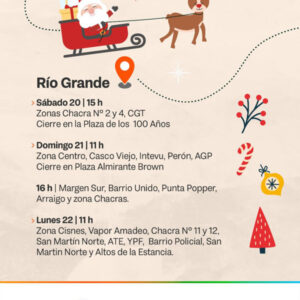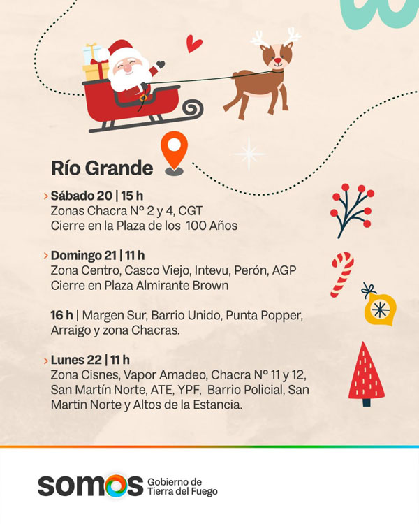 En Río Grande, el recorrido comenzará el sábado 20 de diciembre a las 15 horas, visitando las zonas de Chacra N° 2 y 4 y CGT, con cierre en la Plaza de los 100 Años. El domingo 21 de diciembre, desde las 11 horas, Papá Noel recorrerá la Zona Centro, Casco Viejo, Intevu, Perón y AGP, finalizando en la Plaza Almirante Brown. Ese mismo día, a partir de las 16 horas, continuará por Margen Sur, Barrio Unido, Punta Popper, Arraigo y la zona de Chacras. El lunes 22 de diciembre, desde las 11 horas, visitará la Zona Cisnes, Vapor Amadeo, Chacra N° 11 y 12, San Martín Norte, ATE, YPF, Barrio Policial y Altos de la Estancia.