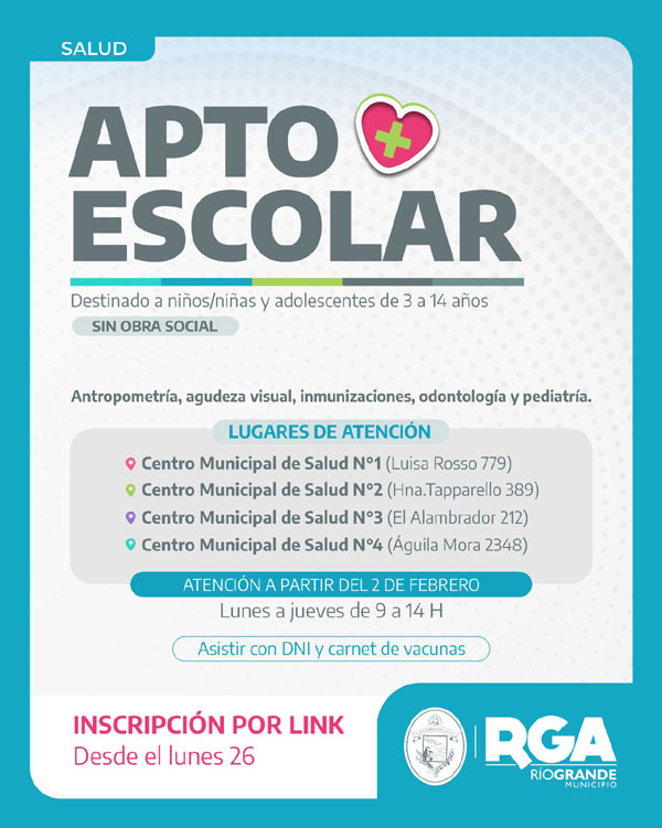 RIO GRANDE.-    El área de Salud Municipal; pondrá en marcha el Circuito de Salud Escolar 2026, una propuesta destinada a infancias y adolescentes desde los 3 hasta los 14 años que no cuenten con obra social. La iniciativa permite obtener, en una sola visita, certificados de aptitud física y bucodental, controles médicos y actualización de vacunas, de manera gratuita, en los Centros de Salud Municipales de Río Grande.