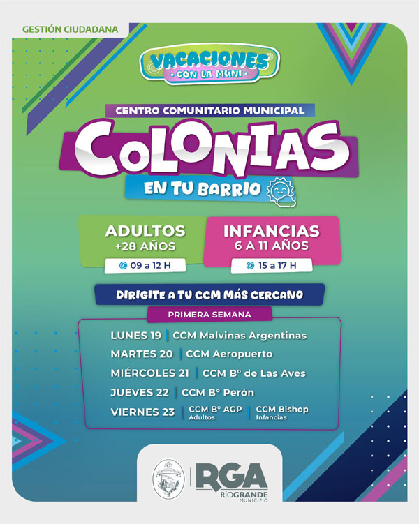 RIO GRANDE.-    Con el objetivo de garantizar el acceso a propuestas recreativas, culturales y de formación durante el verano, el Municipio de Río Grande impulsa “Colonias en tu barrio”, una colonia itinerante que recorrerá los distintos Centros Comunitarios Municipales (CCM) de la ciudad, acercando diversas actividades a cada barrio.