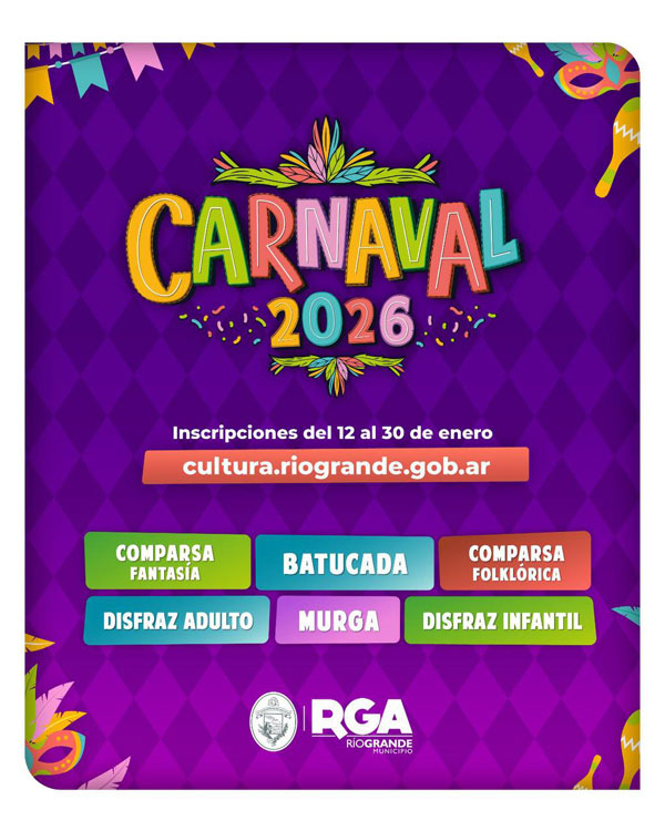 El Municipio de Río Grande invita a las agrupaciones de murgas, comparsas y batucadas de toda la provincia a sumarse y participar del Carnaval 2026 de la ciudad. Por ello, quienes estén interesados en ser parte deben hacerlo de manera online en el sitio web: https://cultura.riogrande.gob.ar/. Cabe mencionar que las inscripciones permanecerán abiertas hasta el 30 de enero.