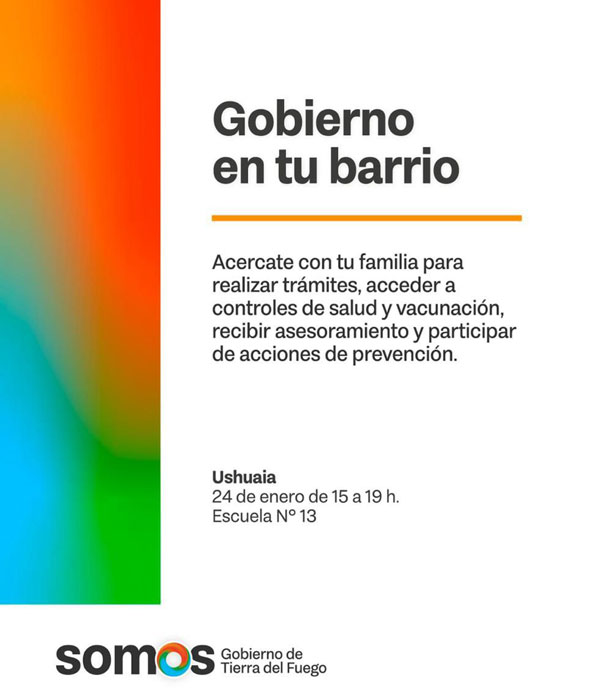 USHUAIA.-    El Gobierno Provincial llevará adelante este sábado 24 de enero, de 15 a 19 horas, una nueva jornada del programa Gobierno en Tu Barrio, destinada a vecinas y vecinos de Ushuaia, con una propuesta especialmente pensada para que las familias puedan acercarse, compartir la tarde y acceder de manera simple y cercana a distintos trámites, servicios y acciones de cuidado.