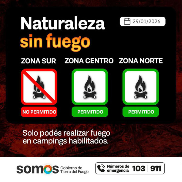 PROVINCIAL.-    El día de hoy, en las ciudades de Tolhuin y Río Grande, está permitido hacer fuego, únicamente en campings habilitados, mientras que en Ushuaia está prohibido hacer fuego, aún en sitios habilitados.