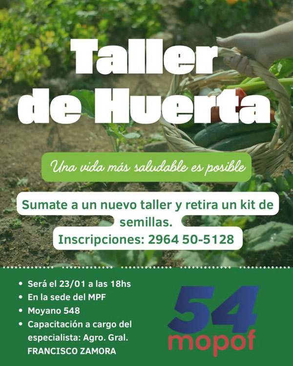 RIO GRANDE.-    El Movimiento Popular Fueguino invita a la comunidad a participar de un Taller de Huerta Familiar, que se realizará el viernes 23 de enero a las 18 horas en la sede del MPF, ubicada en Moyano 548.