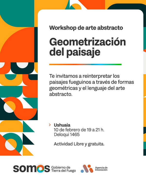 USHUAIA.- La Secretaría de Cultura invita a la comunidad a participar del Workshop de Geometrización del Paisaje – Arte abstracto a través de la geometría, que se realizará en Ushuaia, el martes 10 de febrero, de 19 a 21 horas, en Deloqui 1465, en el marco de la muestra artística Argentina Abstracta. Es abierto y gratuito, y no requiere inscripción previa.