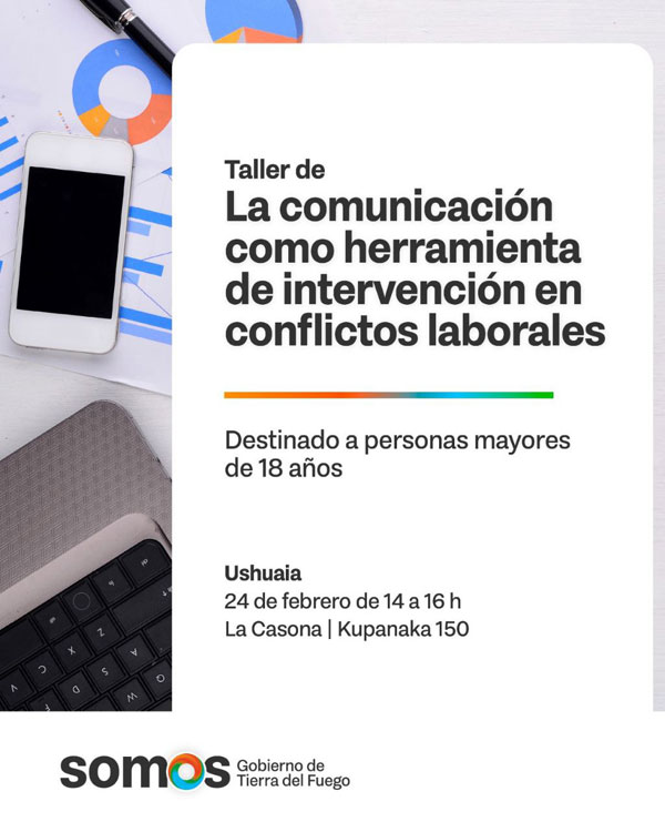 USHUAIA.- El Ministerio de Trabajo y Empleo llevará adelante una nueva edición del taller gratuito “La comunicación como herramienta de intervención en conflictos laborales”. La actividad se desarrollará el martes 24 de febrero, de 14 a 16 horas, en La Casona, ubicada en Karukinka 150, Ushuaia. Está destinada a personas interesadas en fortalecer sus herramientas comunicacionales para el ámbito laboral.