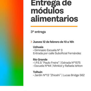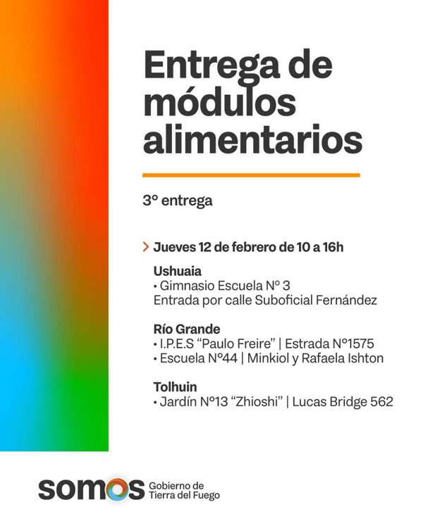 • En Ushuaia será en el Gimnasio de la Escuela Nº 3 (entrada por Calle Suboficial Fernández); en Río Grande en el I.P.E.S “Paulo Freire” (Estrada N°1575) y en la Escuela N°44 (Minkiol y Rafaela Ishton) y en la ciudad de Tolhuin será en el Jardín N°13 “Zhioshi” (Lucas Bridge 562).    Para mayor información podrán comunicarse de 11:00 a 16:00 horas únicamente con las oficinas de Comedores Escolares Ushuaia (02901) 15405104.