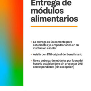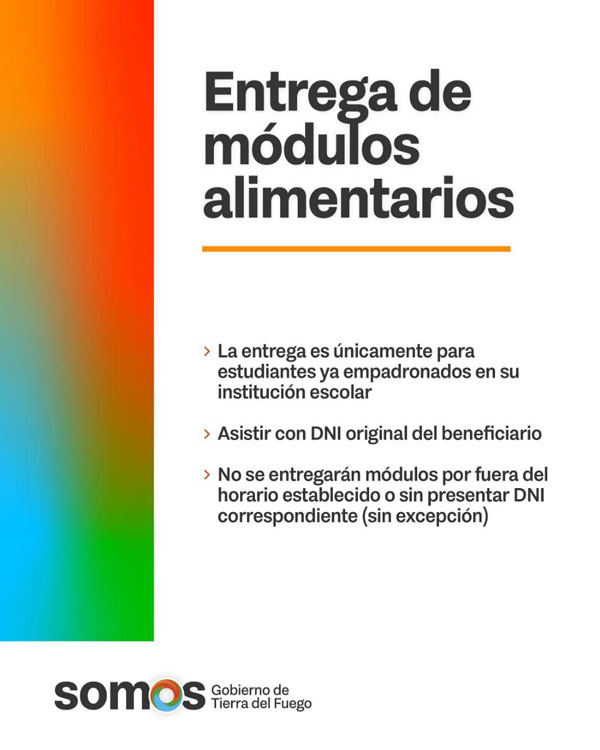 Se recuerda a las familias que es necesario estar empadronado en cada institución escolar para acceder a los módulos alimentarios. Asimismo se solicita asistir con DNI original del beneficiario y se recuerda que no se entregarán módulos por fuera del horario establecido o sin presentar DNI correspondiente (sin excepción).