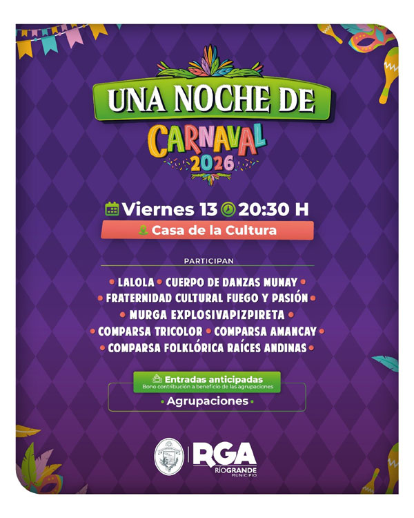 RIO GRANDE.- El Municipio de Río Grande invita a vecinos y vecinas a disfrutar de “Una noche de Carnaval”, una propuesta cultural pensada para compartir música, danza y alegría en comunidad, que se realizará el viernes 13 de febrero, a partir de las 20:30 horas, en la Casa de la Cultura de nuestra ciudad .
