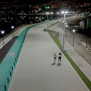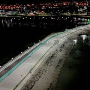 USHUAIA.- En el marco de los trabajos finales de la obra de remodelación y puesta en valor de la Pasarela Luis Pedro Fique, se realizó la primera prueba del sistema de alumbrado del emblemático espacio de Ushuaia.