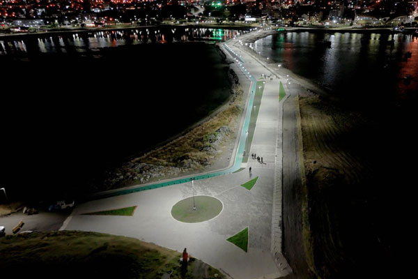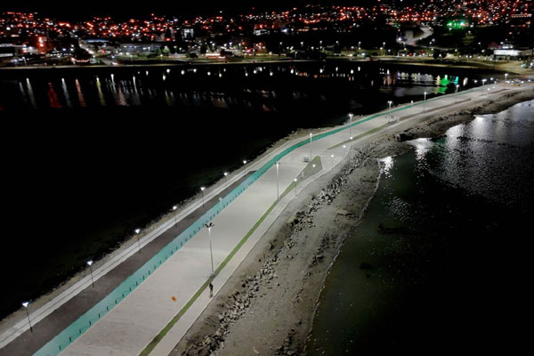 USHUAIA.- En el marco de los trabajos finales de la obra de remodelación y puesta en valor de la Pasarela Luis Pedro Fique, se realizó la primera prueba del sistema de alumbrado del emblemático espacio de Ushuaia.