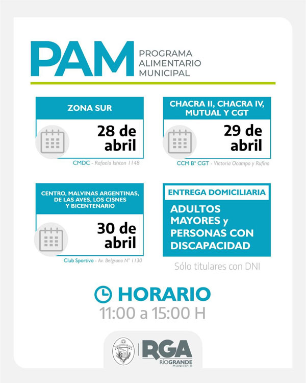 RIO GRANDE.-    El Municipio de Río Grande recuerda a los vecinos y vecinas que este martes 28 de abril comienza la distribución de los módulos alimentarios en diferentes puntos de la ciudad, destinada a quienes están empadronados en el Programa Alimentario Municipal.