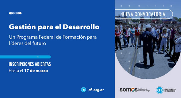 PROVINCIAL.- El Gobierno de la Provincia de Tierra del Fuego AIAS invita a jóvenes fueguinos a participar del Programa Federal de Formación “Gestión para el desarrollo” del Consejo Federal de Inversiones en su cuarta...